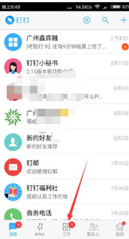 2、注冊(cè)一個(gè)自己的賬號(hào),然后加入你所在公司的群組。點(diǎn)擊下方工具欄中的“工作”