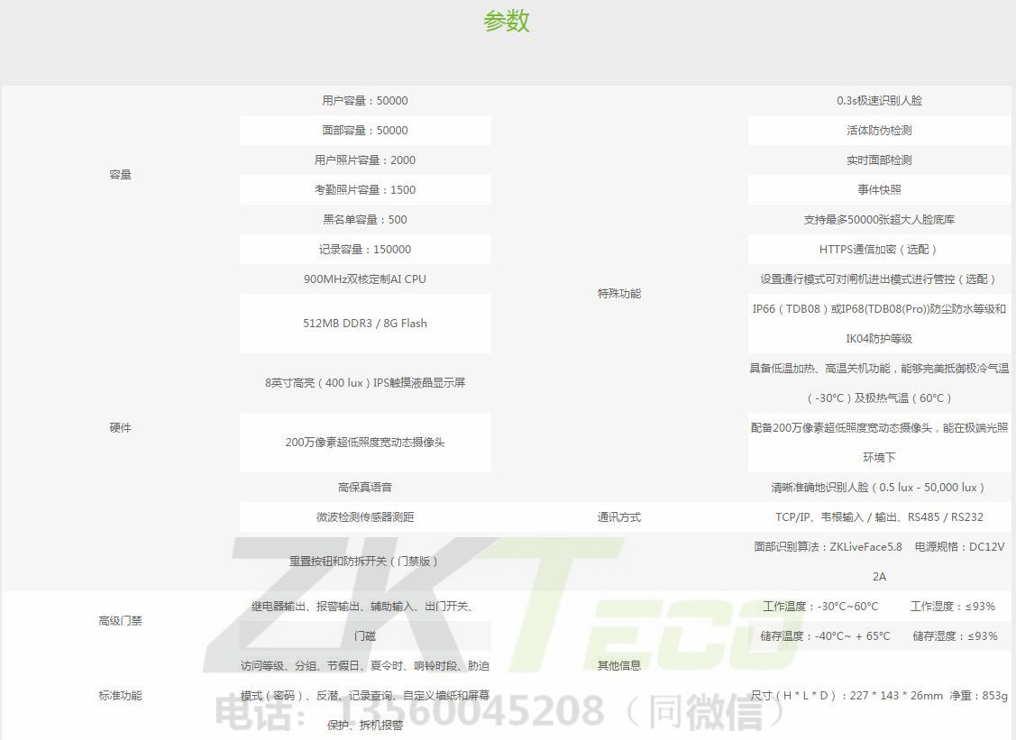 TDB08是中控智慧可見光產品系列的全面升級版本,適用各種場景。TDB08搭配最新定制的AI CPU,用于運行面部識別算法,以提高其各方面的性能。配備強大的CPU和最新AI深度自主學習面部識別算法,揭開生物識別領域新篇章。此版本支持最多50,000張人臉底庫,人臉識別速度小于0.3秒,采用雙目光電硬件+活體識別算法,對打印的高清人臉圖片、照片、人臉圖像視頻以及各種材料面具的攻擊,具有較強的防偽能力。除強大的CPU和人臉算法,TDB08還配備了最新的超低照度寬動態攝像頭,使終端能夠在極暗環境下(0.5 lux)進行人臉識別,同時應用微波探測器,精確計算用戶與設備之間的距離,從而喚醒識別終端。設計堅固耐用,可在極端天氣下正常運作,能夠完美抵御極冷氣溫(-30°C)及極熱氣溫(60°C);可達到IP66(TDB08)或IP68(TDB08(Pro))防塵防水標準及IK04防護等級標準,增強其戶外耐用性。