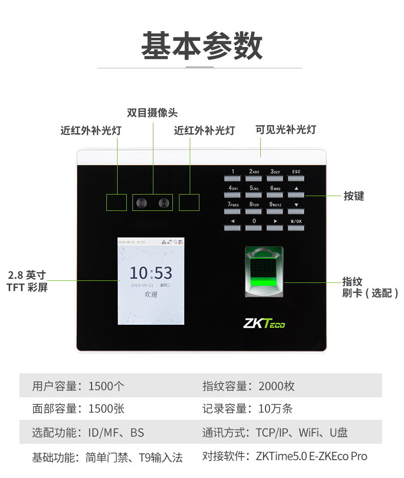中控xface100 wifi無(wú)線人臉識(shí)別門禁是廣州中控全新推出的一款多光譜智能指紋面部考勤機(jī),采用Linux操作系統(tǒng),運(yùn)用高性能人臉識(shí)別算法,0.5秒內(nèi)快速識(shí)別。配置200萬(wàn)高清雙目攝像頭,實(shí)現(xiàn)精準(zhǔn)人員身份驗(yàn)證。兼具門磁、報(bào)警、開(kāi)鎖、出門開(kāi)關(guān)等門禁管理功能,滿足大眾化需求,守護(hù)辦公環(huán)境安全,適用于酒店考勤、社區(qū)門禁等場(chǎng)景需求。此外,根據(jù)需求可進(jìn)行精細(xì)化管理平臺(tái)定制,實(shí)現(xiàn)時(shí)間和安全的高效。 用戶容量1500個(gè)指紋容量2000枚面部容量1500張記錄容量10萬(wàn)條顯示屏2.8寸彩屏通訊方式TCP/IP、WIFI基礎(chǔ)功能U盤(pán)功能、攝像頭、T9輸入法、記錄查詢使用溫度0℃~45℃使用濕度20%RH~80%RH電源規(guī)格DC12V/1.5A尺寸138*170*32.3mm